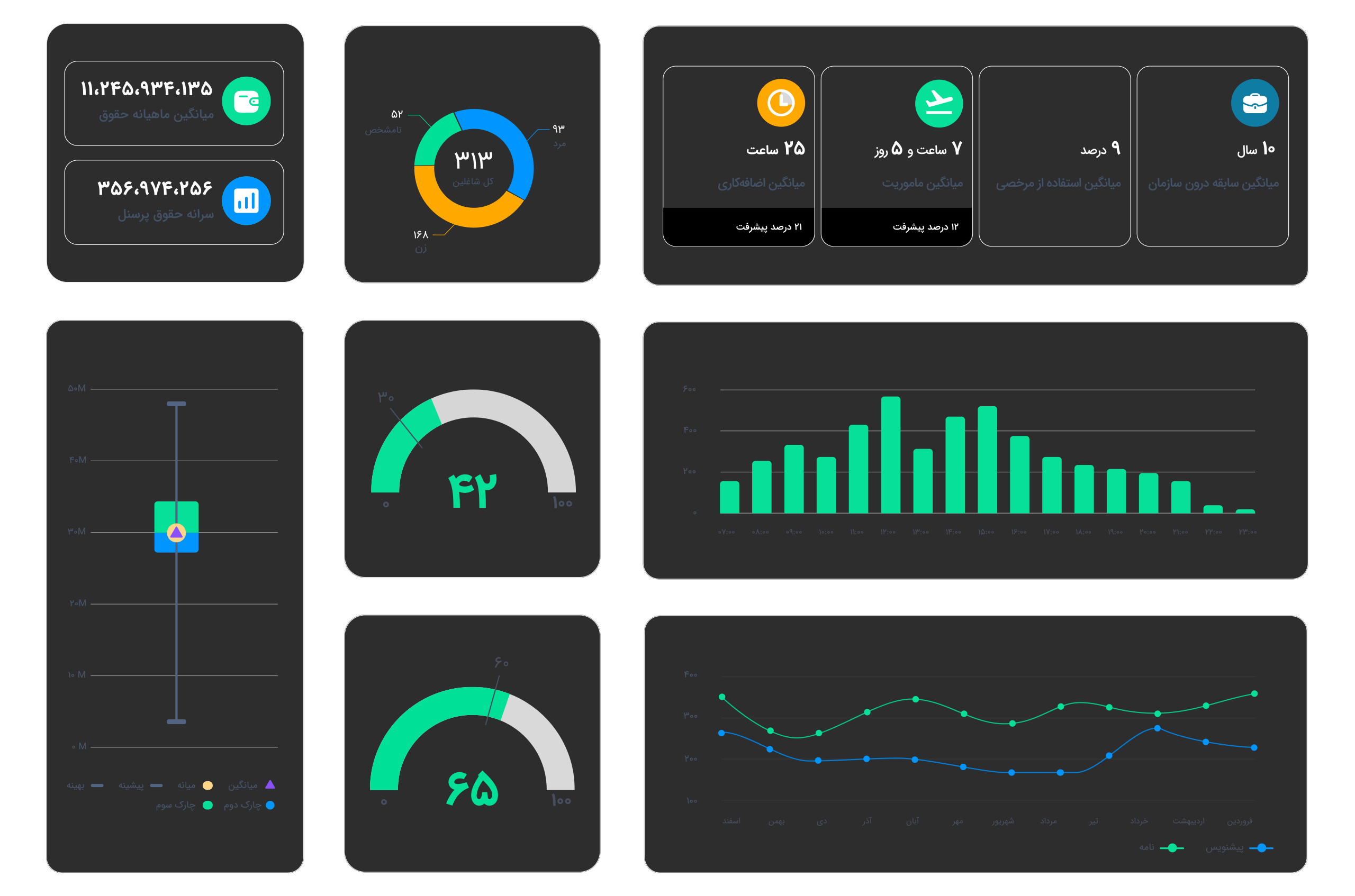 | داشبورد مدت زمان مرخصی و سرانه ساعات مرخصی این داشبورد برای تحلیل عمقی مدت زمان استفاده از مرخصی طراحی شده و با سنجش سرانه ساعات مرخصی بر اساس زمان، نوع مرخصی، ویژگیهای فردی و محل خدمت، به سازمان کمک میکند تا الگوهای رفتاری، فشار کاری و نیاز به انعطافپذیری را در سطح کارکنان مختلف شناسایی و مدیریت کند. | داشبورد تعداد مرخصی و سرانه تعداد مرخصی تمرکز این داشبورد بر بررسی فراوانی مرخصیهای ثبتشده و تحلیل الگوهای رفتاری در سازمان است. با استفاده از دادههایی همچون جنسیت، سابقه، وضعیت تأهل و رسته شغلی، میتوان سیاستهای متناسبسازی شرایط کاری را برای بهبود تعادل کار و زندگی در نظر گرفت. | داشبورد نسبت پرسنل در مرخصی به کل پرسنل این داشبورد نمایی درصدی از کارکنانی که در بازههای زمانی مختلف در مرخصی هستند، ارائه میدهد. با تحلیل روندها در روزهای هفته، دپارتمانها یا سطوح شغلی، امکان شناسایی نقاط پرریسک برای کاهش بهرهوری یا ازدحام کاری فراهم میشود. این دادهها پایهای برای تنظیم منابع انسانی و بهینهسازی برنامهریزی نیروی کار خواهند بود. |