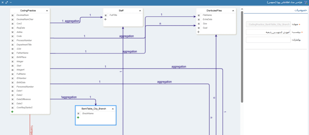 مطابق شکل 2 یک ارتباط از نوع Aggregation یک به یک بین مدل داده ای فرایند و پایین ترین سطح از مدل داده پایه مورد نظر ایجاد شده است و رابطه به صورت Cascading Combo روی فرم قرار گرفته است.