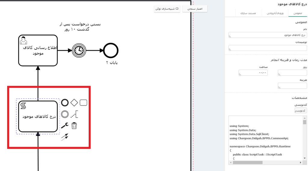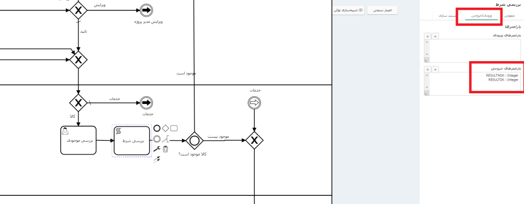 پس از ایجاد جدولهای مربوطه در مدل دادهای جهت تفکیک کالاهای موجود و ناموجود در یک فعالیت کدنویسی کد زیر را قرار داده و در بخش پارامترهای خروجی، متغیرهایی که قرار است مسیر کالاهای موجود و ناموجود را مشخص کند، تعریف میکنیم (شکل 2).