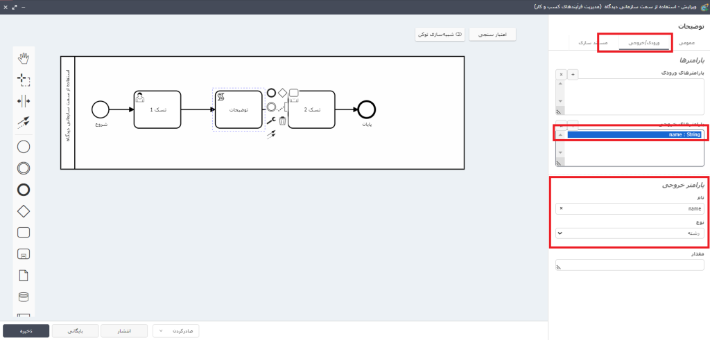 در تب ورودی و خروجی فعالیت کدنویسی، در قسمت خروجی متغیری از نوع رشته ایجاد میکنیم و نام آن را برابر با متغیر ایجادشده در کد (Name) قرار میدهیم (شکل 2).