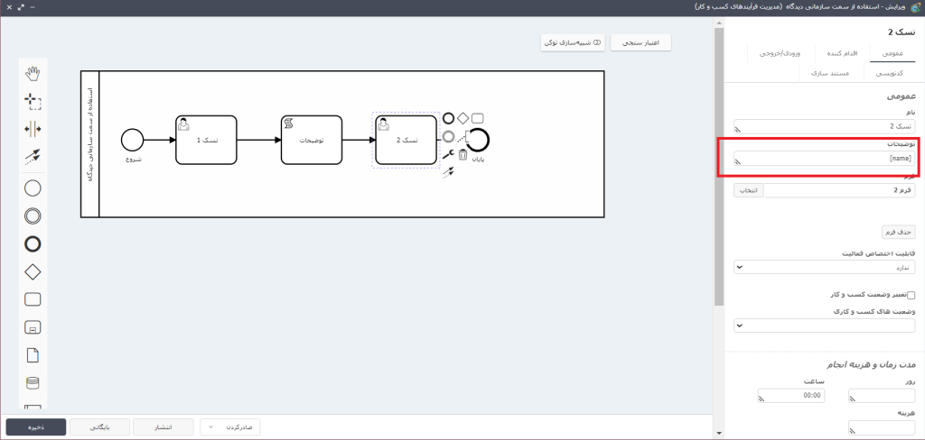 در فعالیت کاربر بعد از فعالیت کدنویسی در تب عمومی در قسمت توضیحات داخل براکت نام متغیری که در داخل کد ایجاد شده است را وارد میکنیم (شکل 3).