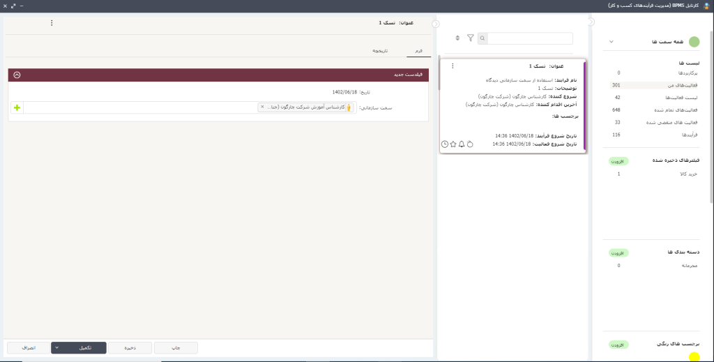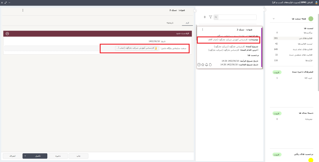 پس از اجرای فرایند در صورتی که در فعالیت کاربر ابتدای فرایند فیلد سمت سازمانی دیدگاه مورد نظر بر روی فرم مقدار بگیرد (شکل 4)، پس از اجرای کد ارائهشده عنوان سمت کامل در توضیحات فعالیت کاربر پس از فعالیت کدنویسی درج میشود (شکل 5) و میتوان بر اساس آن در کارتابل و آرشیو فعالیتها به جستجو پرداخت.