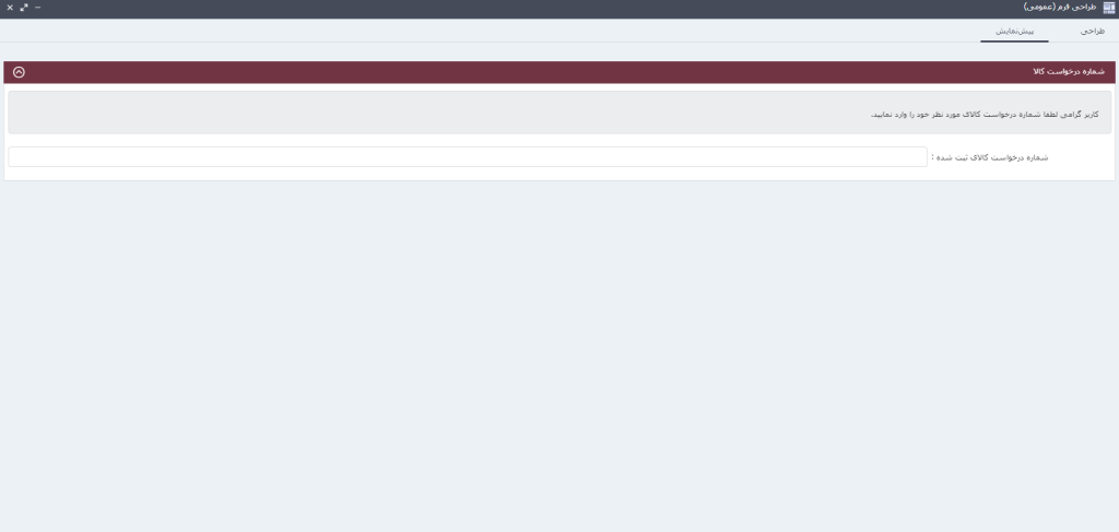 در فرایند پرداخت باید یک فرم در شروع فرایند که حاوی فیلدی برای وارد کردن شماره درخواست کالا است توسط درخواستکننده پر شود (شکل 2). با درج شماره نمونه فرایند درخواست کالا در ابتدای فرایند درخواست پرداخت، میتوانیم در کدی که در ادامه ارائه خواهد شد، اطلاعات نمونه فرایند کالا را از پایگاه داده نرمافزار استخراج کنیم. فیلد شماره درخواست کالا ثبتشده را در خروجی فعالیت کاربری که مقدار میگیرد به عنوان پارامتر خروجی اضافه میکنیم تا بتوانیم از مقدار آن در کدنویسی استفاده کنیم.