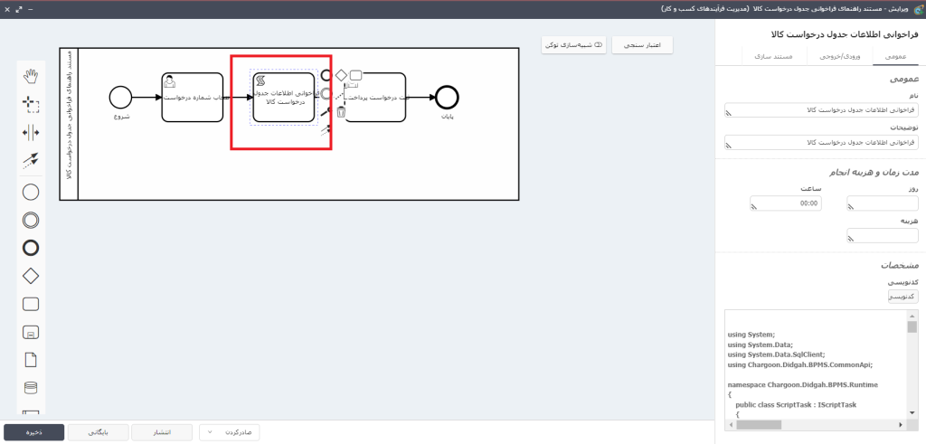 در فرایند پرداخت برای فراخوانی اطلاعات جدول فرایند درخواست کالا، یک فعالیت از نوع کدنویسی ایجاد میشود (شکل 3).