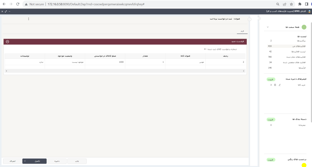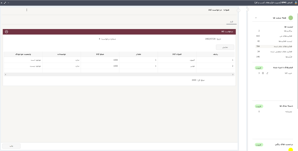 یک راهحل: در فرایند درخواست کالا جدولی ایجاد میکنیم که در زمان اجرای فرایند، در آن جدول کالاهای درخواستی درج میشود و در آن باید وضعیت موجود بودن کالا نیز مشخص شود (شکل 1).