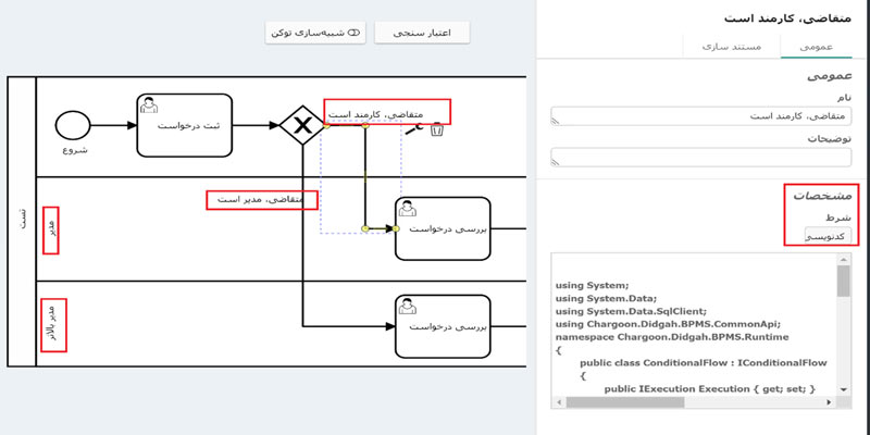 برای مثال اگر اقدامکننده فعالیت ثبت درخواست، کارمند باشد، اقدامکننده فعالیت بررسی درخواست توسط مدیر انجام میشود و اگر اقدامکننده فعالیت ثبت درخواست، مدیر باشد اقدامکننده فعالیت بررسی درخواست باید توسط مدیر بالاتر انجام شود.