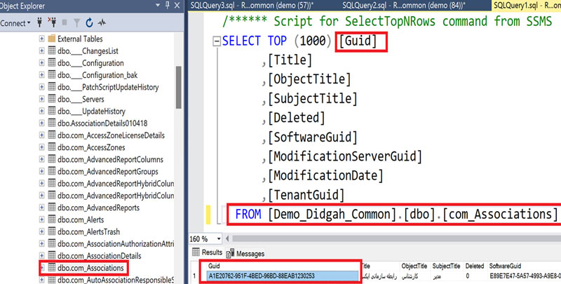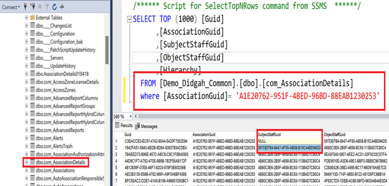 ابتدا باید طبق تصاویر، از دیتابیس Common، جدول [Associations]، Guid رابطه سازمانی مورد نظر را بیابیم و آن را در ‘AssociationGuid’ جایگذاری کنیم و از جدول [AssociationDetails]، اولین SubjectStaffGuid را در ‘ SubjectStaffGuid ‘ جایگذاری کنیم.