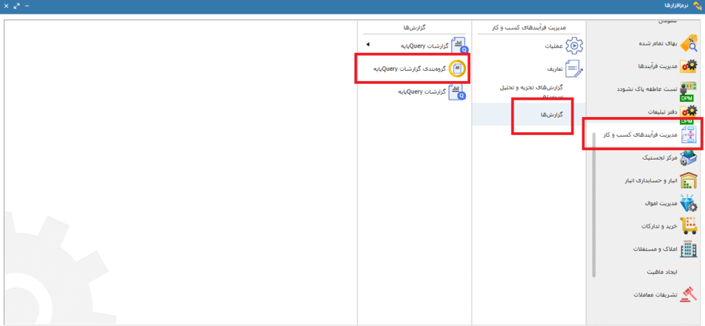 برای این کار ابتدا در قسمت گزارش ها، گروه بندی گزارشات Query پایه را انتخاب کرده و در قسمت گروهبندی گزارشات Query پایه گروهی را برای گزارش مورد نظر ایجاد میکنیم. تصاویر 1 و 2