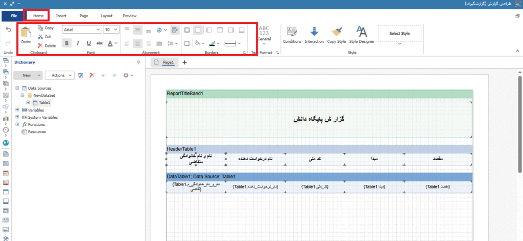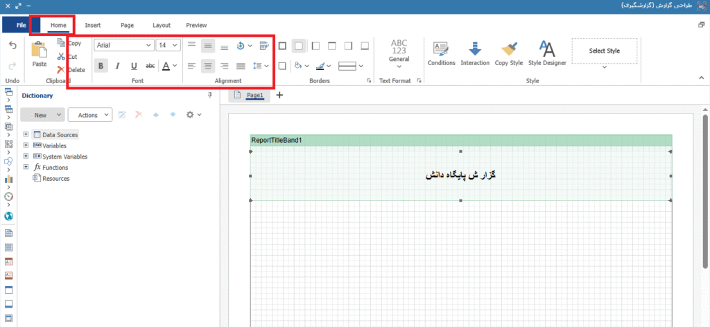 در قسمت Home، امکان تغییر مشخصات فونت گزارش و نحوه نمایش آن وجود دارد. تصویر10