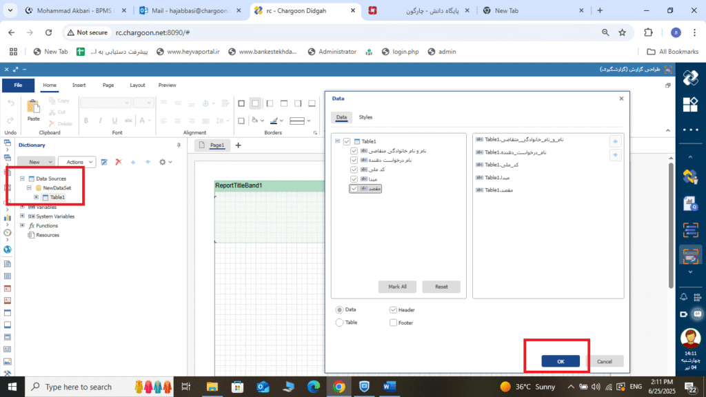 برای اضافه نمودن کوئری گزارش به طراحی جهت ایجاد ستون ها، در قسمت Data Sources، NewDataSet، Table1 کوئری اضافه شده وجود دارد که با Drag&Drop آن بر روی صفحه طراحی گزارش، قسمت Data باز می شود. در این قسمت امکان انتخاب ستون های گزارش وجود دارد و با انتخاب گزینه Ok جدول گزارش ایجاد می شود. تصویر11