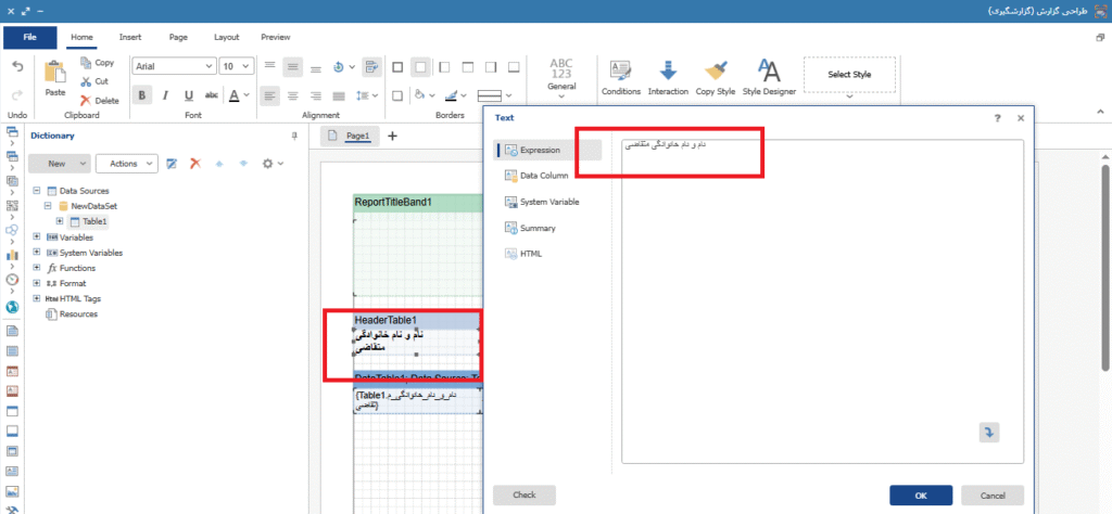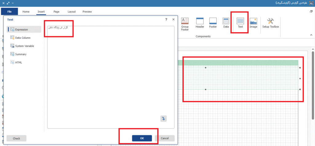 در قسمت Text، امکان افزودن عنوان برای تیتر گزارش وجود دارد. برای اینکار با انتخاب گزینه Text و انتخاب قسمت مورد نظر، عنوان گزارش وارد می شود و با کلیک بر روی گزینه Ok، عنوان ایجاد می شود. تصویر9