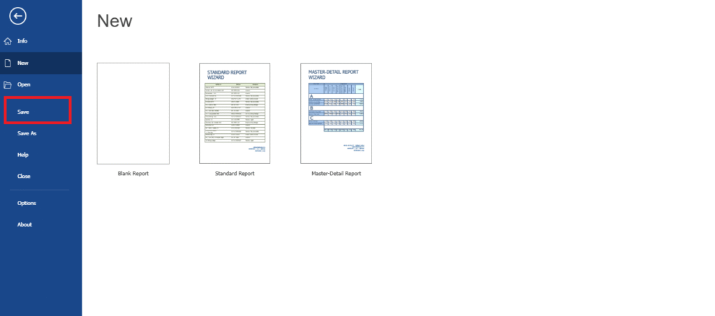 پس از طراحی گزارش، با استفاده از گزینه save در قسمت File، طراحی الگو انجام می شود. تصویر14 و 15