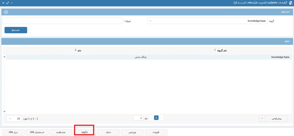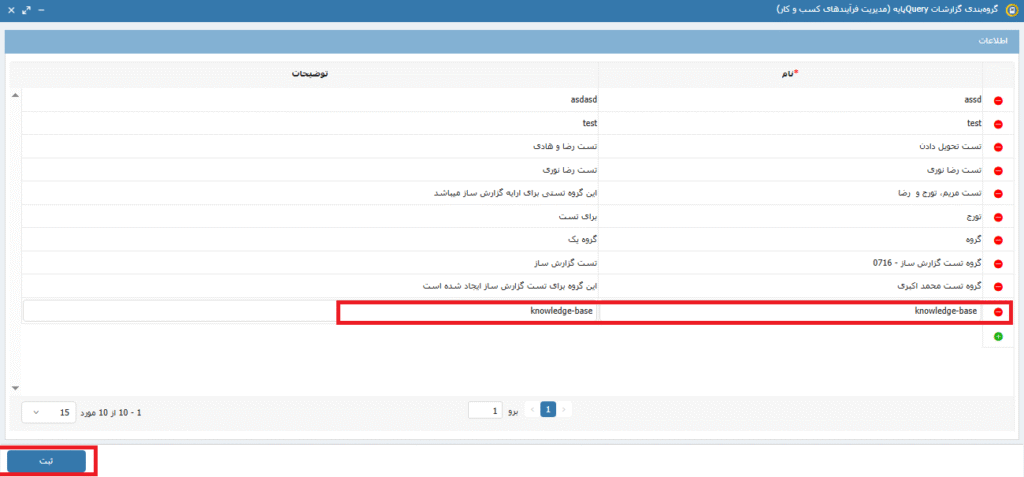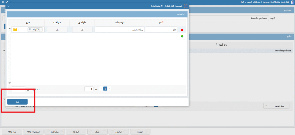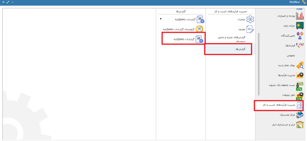 پس از تعریف گروهبندی از از قسمت گزارشات Query پایه بر روی گزینه افزودن کلیک کرده ودر صفحه ی ایجاد گزارش کوئری نوشته شده را paste میکنیم، در صورتی که پارامتری در کوئری تعریف شده در قسمت پارامترها آن(ها) را تعریف مینماییم سپس گروه ایجاد شده را انتخاب کرده و عنوانی را برای گزارش مورد نظر انتخاب کرده و با زدن دکمه ی ثبت گزارش را ذخیره میکنیم. تصاویر 3، 4 و 5