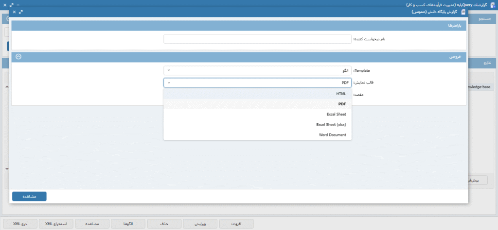 نکته 3: در قسمت قالب نمایش، امکان خروجی گرفتن از گزارش در حالت های: HTML، PDF، Excel Sheet، xlsx و Word document وجود دارد. تصویر 17