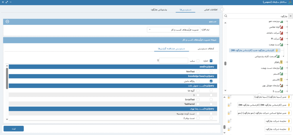جهت تعریف دسترسی دریافت گزارش ایجاد شده به سمت های مورد نظر ، در مرکز مدیریت به قسمت ساختار سازمان می رویم. با انتخاب سمت مورد نظر در قسمت دسترسی ها، نرم افزار مدیریت فرآیندهای کسب و کار را انتخاب کرده و در بخش دسترسی مشاهده گزارش ها، دسترسی گزارش ایجاد شده به سمت داده شده و در نهایت با انتخاب گزینه ثبت، دسترسی سمت ایجاد می شود. تصویر18