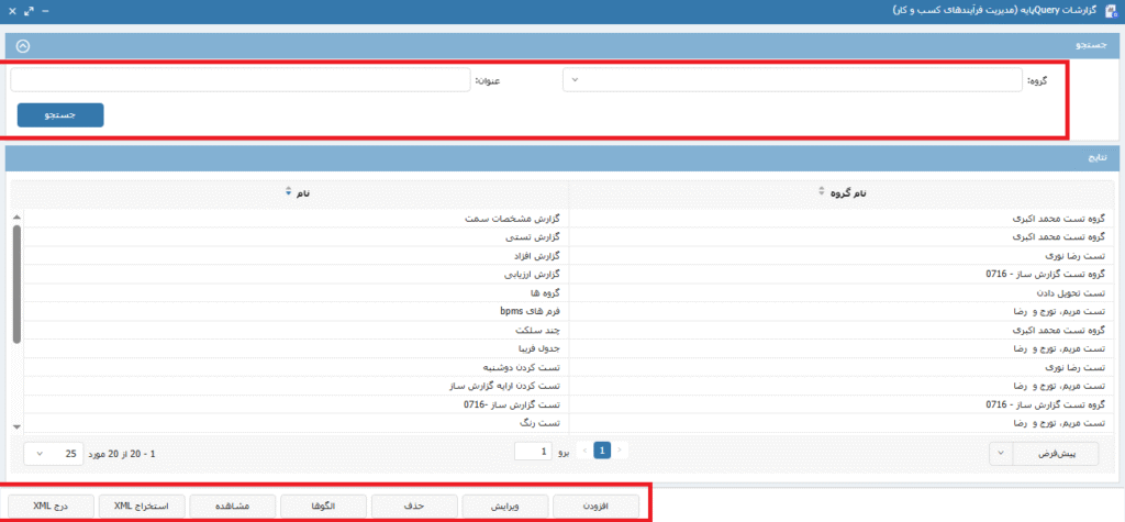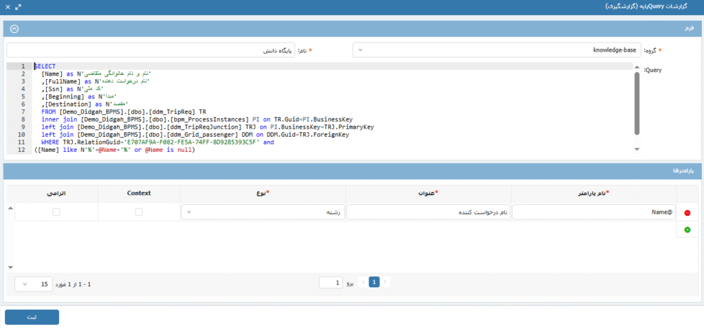 نکته 1: در صورت تعریف پارامتر در کوئری نوشته شده امکان جستجو در قسمت پارامترها برای دریافت گزارش با توجه به آن وجود دارد