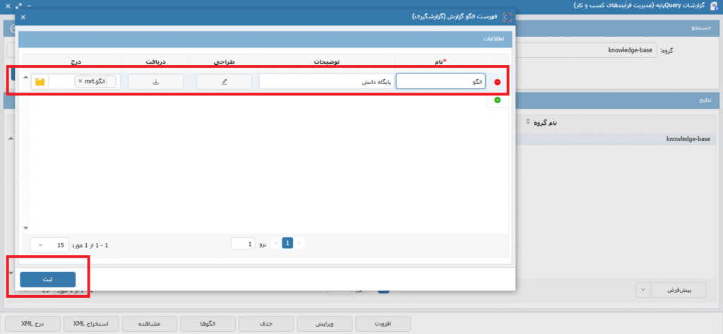 پس ثبت گزارش، جهت امکان دریافت خروجی با انتخاب گزینه الگو، الگویی را ایجاد کرده و روی گزینه ثبت کلیک میکنیم تا ابتدا الگوی مورد نیاز ذخیره شود. تصاوی 6 و 7