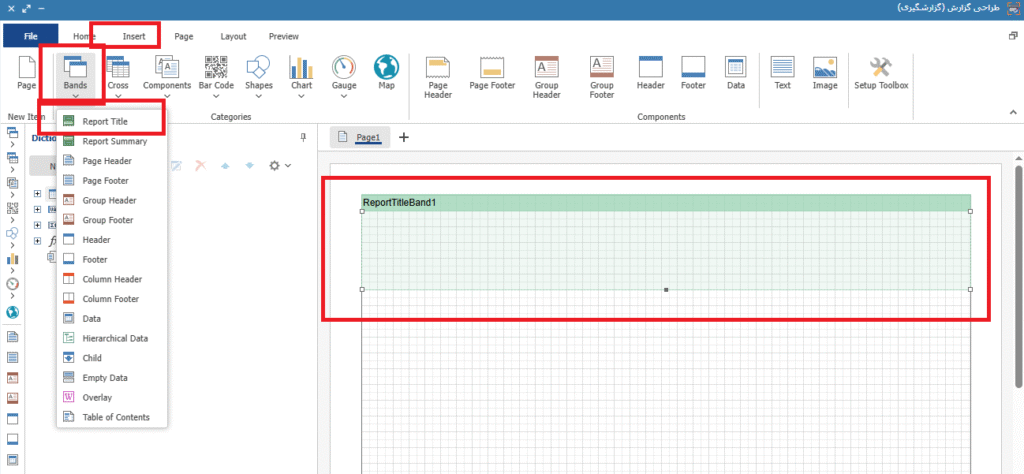 در قسمت Insert، Bands، Report Title، امکان ایجاد تیتر برای گزارش میسر می باشد. با انتخاب گزینه Report Tile و انتخاب کادر تیتر گزارش ایجاد می شود. تصویر8