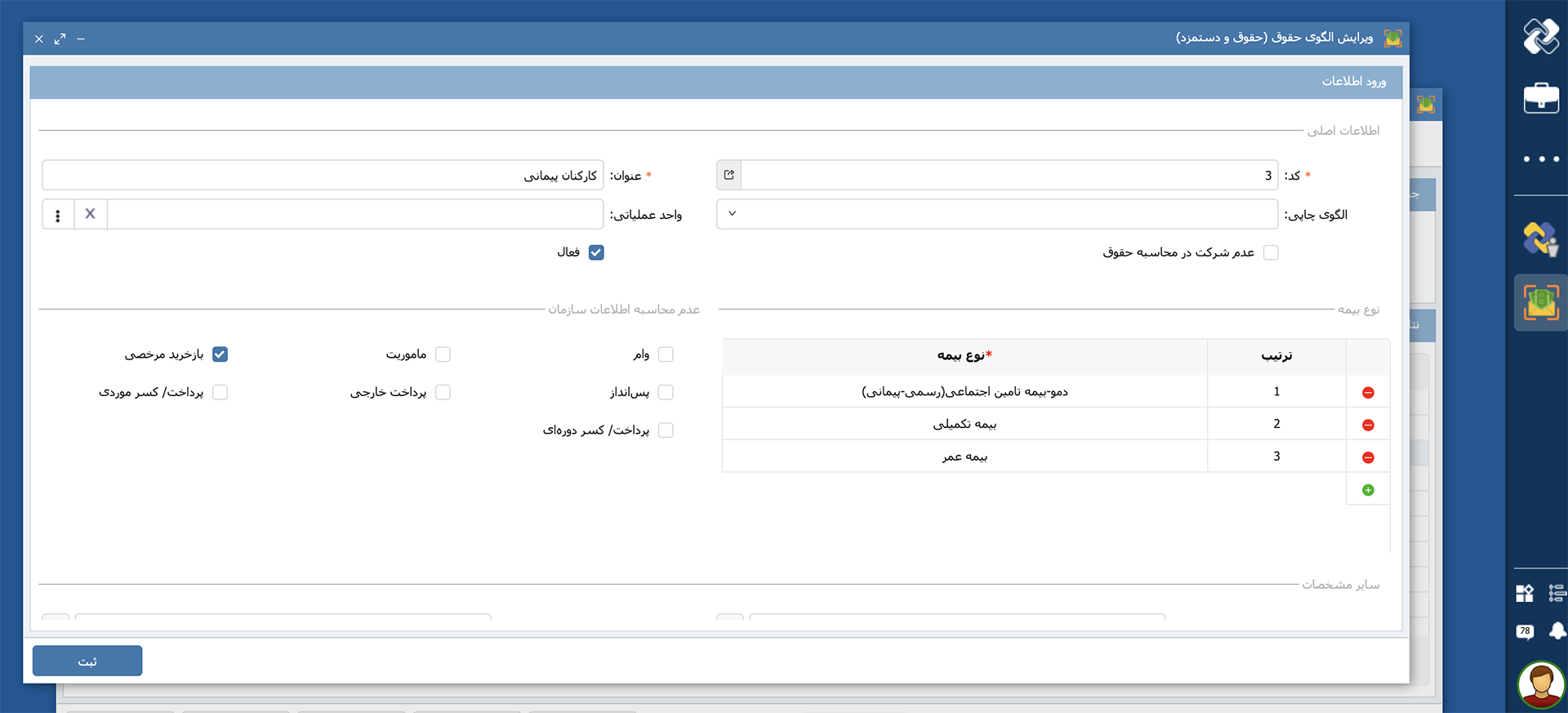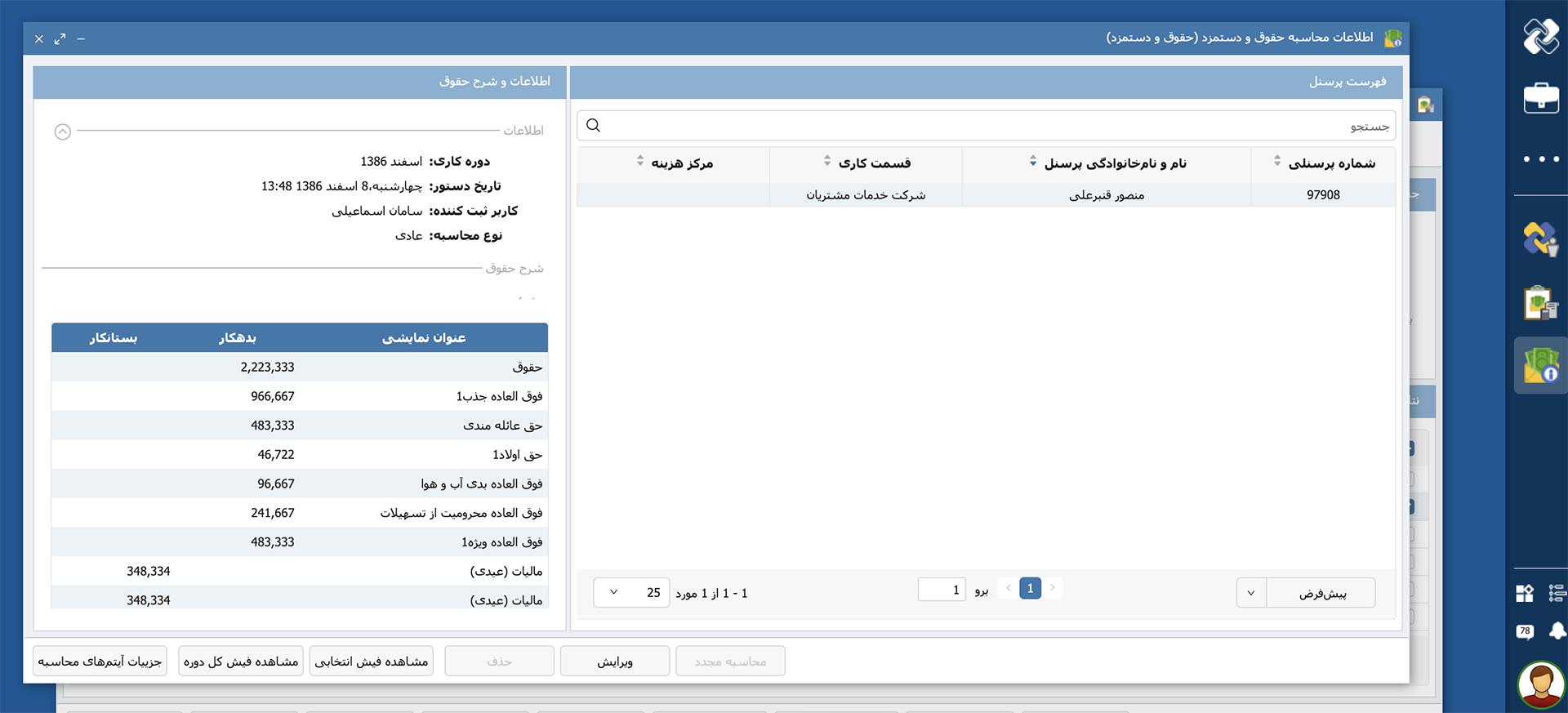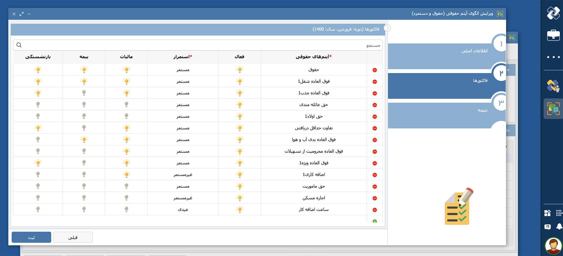 بله، ما این امکان را داریم که تمامی فرمولهای حقوقی، کسورات و مزایای خاص سازمان خود را بدون محدودیت در نرمافزار تعریف و مدیریت کنیم.