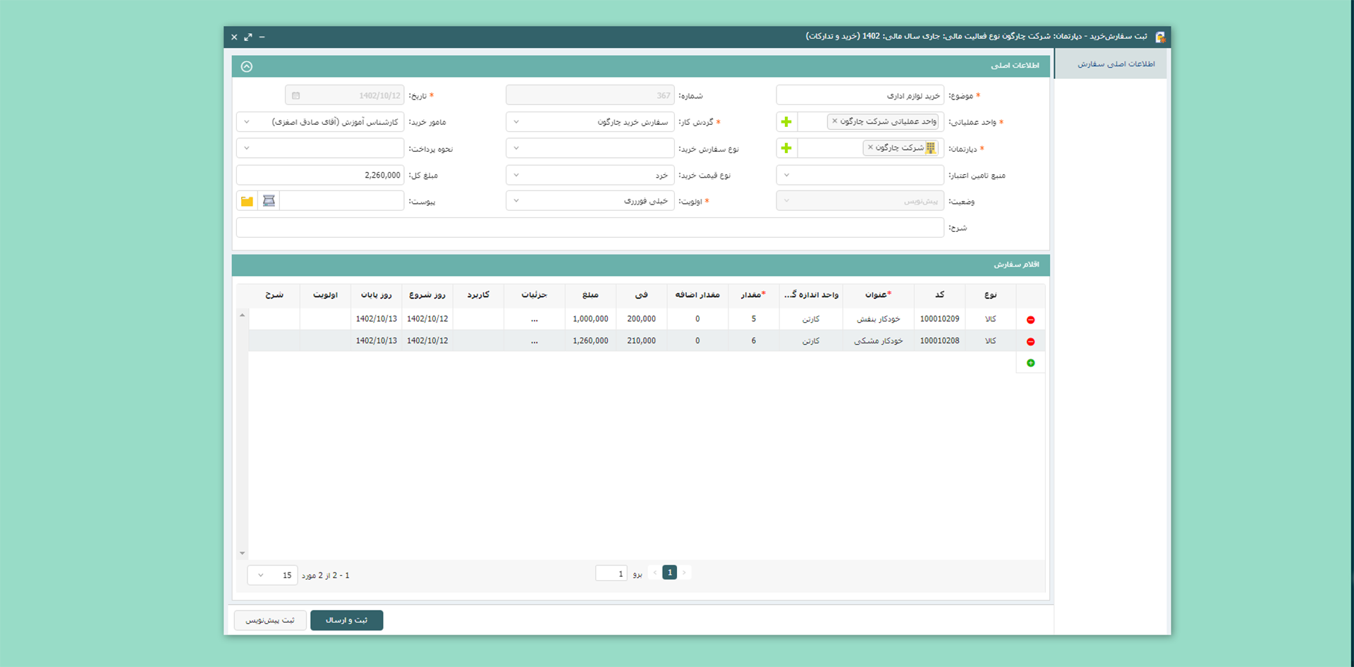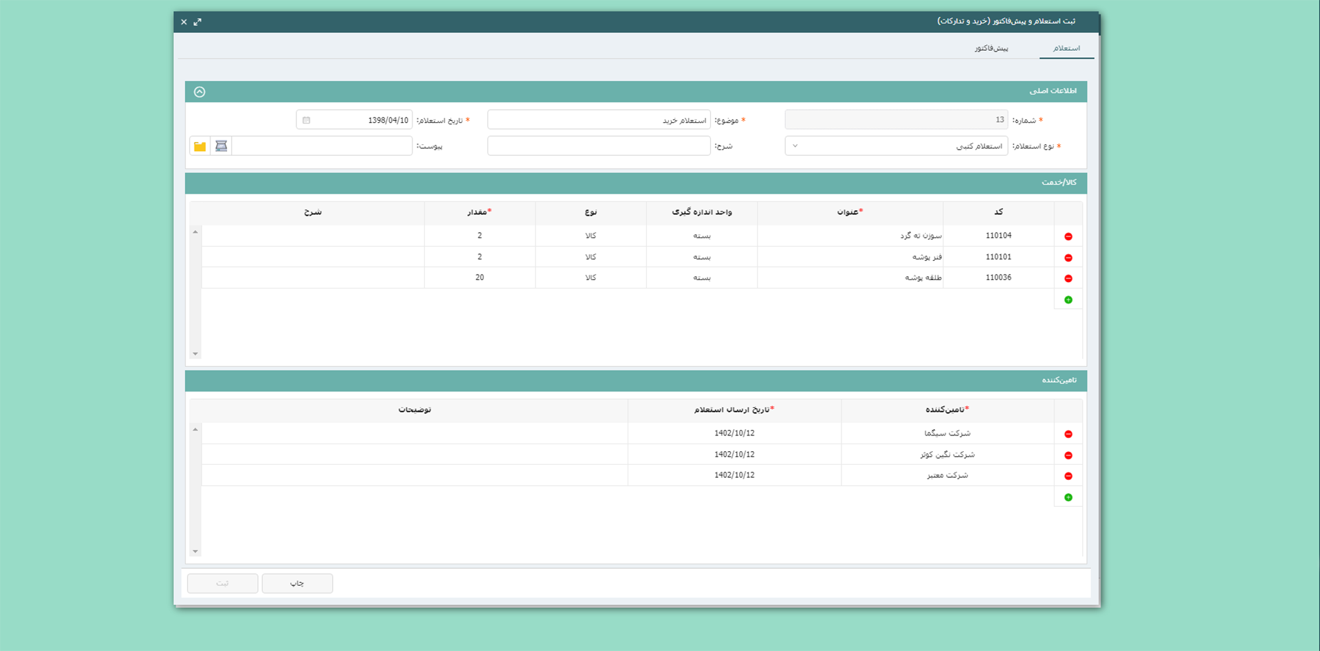تمام اسناد شامل درخواستها، تأییدیهها، صورتجلسات و سوابق کامل تأمینکنندگان در یک بستر متمرکز نگهداری میشود و در هر زمان برای ارائه، بازرسی یا ممیزی آماده است.