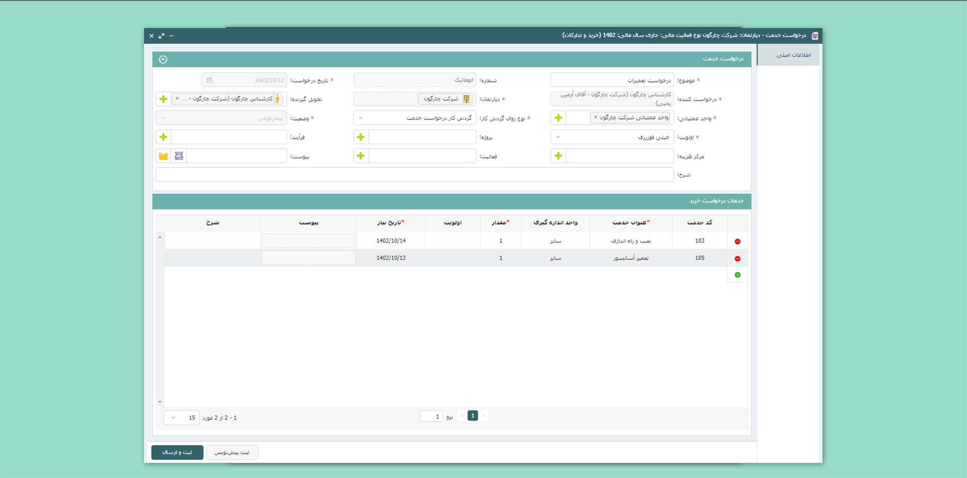 با گردشهای خرید هماهنگ با آییننامه داخلی، هر روند به مأمور خرید مشخص سپرده میشود تا مسئولیتها شفاف و پیگیریها ساده شود. ثبت استعلام، پیشفاکتور و برنده یا اطلاعات مناقصه در خریدهای کلان، انتخاب تأمینکننده را دقیق و قانونی پیش میبرد. همچنین میتوان درخواست خدمت را ثبت و به مجری یا لیست خرید افزود تا کالا و خدمات یکپارچه مدیریت شوند.
