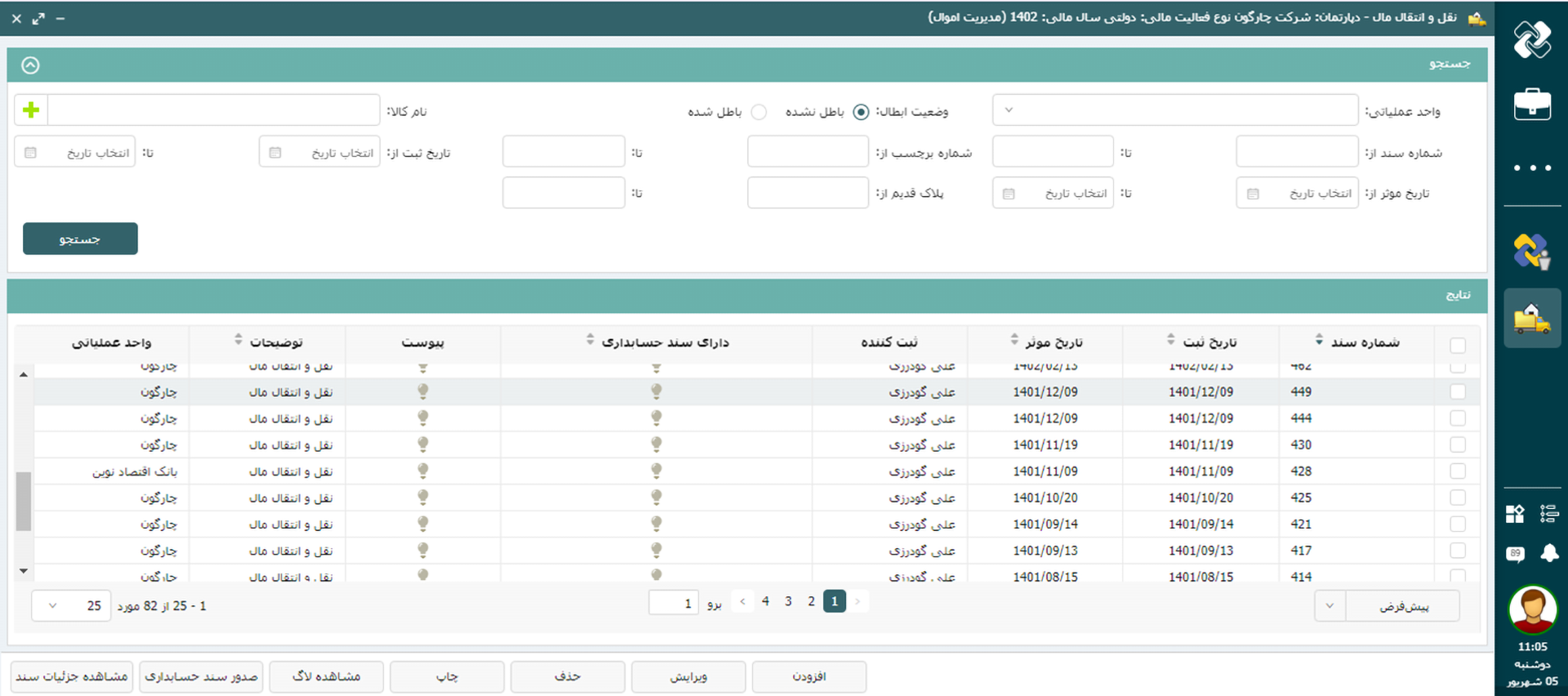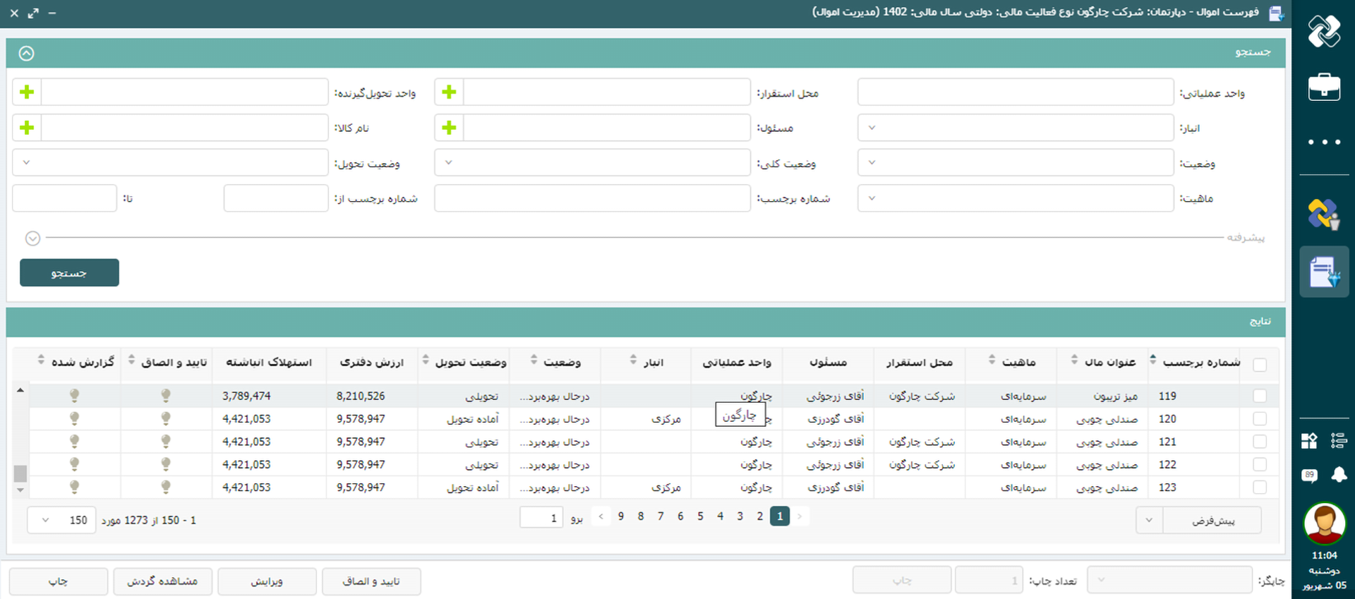 تمام مراحل از ثبت تا خروج دارایی شفاف و مستند ثبت میشود و امکان پیگیری هر رویداد در هر زمان فراهم است؛ این شفافیت، مغایرتها را کاهش میدهد.