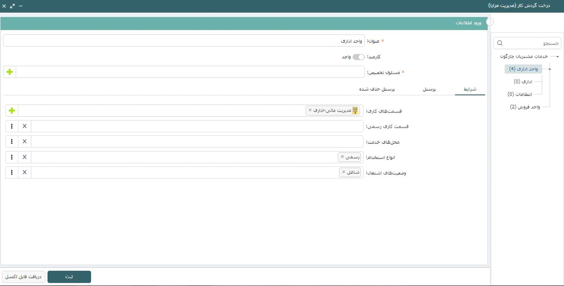 سقف، کف و شرایط پرداخت در بخش تنظیمات سیستم تعریف میشود. این موارد میتواند متناسب با سیاست سازمان یا نیازهای هر گروه کاری متفاوت باشد.