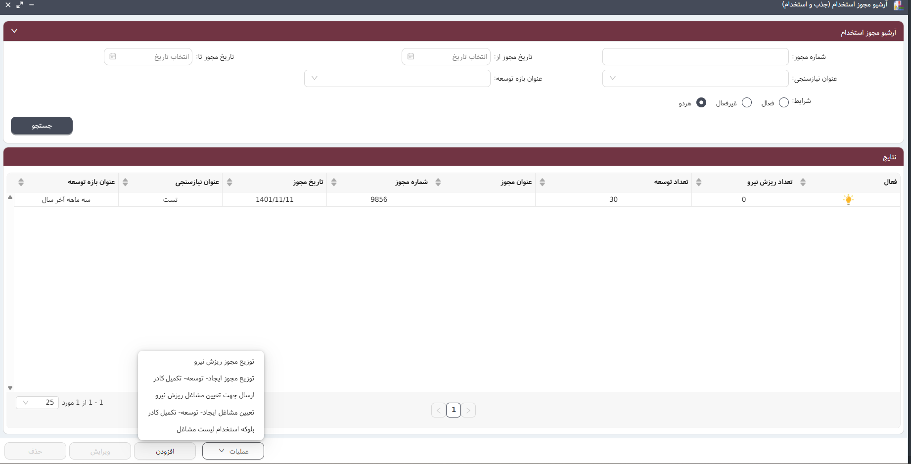 از لحظه تعریف و ثبت مجوز استخدام، فرآیند آغاز جذب تحت کنترل کامل قرار میگیرد. سوابق همه مجوزها در آرشیو امن ذخیره شده و در هر زمان قابل جستوجو و مشاهده است. همچنین، این مجوزها میتوانند برای اهداف مختلف مانند تعدیل نیرو، توسعه یا تکمیل کادر میان بخشها و واحدهای مرتبط توزیع شوند تا تصمیمگیریها هدفمند و هماهنگ باشد.