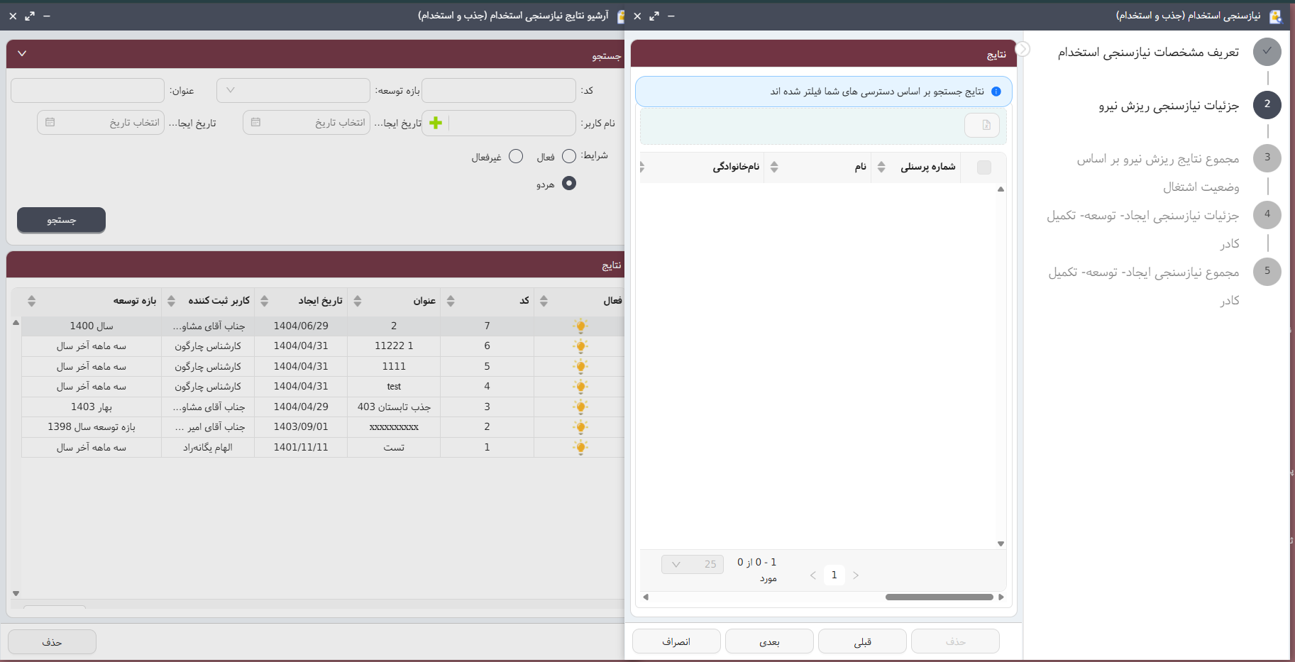 پیش از هر استخدام، فرآیند نیازسنجی دیجیتال اجرا میشود تا اهداف و شاخصهای جذب مشخص شود. فرمهای نیازسنجی بلافاصله در سیستم آرشیو میشوند و در صورت تأیید، به پرونده استخدامی تبدیل میشوند. دلایل درخواست نیرو نیز ثبت و مستند میشود تا شفافیت و انطباق با سیاستهای سازمان تضمین شود.