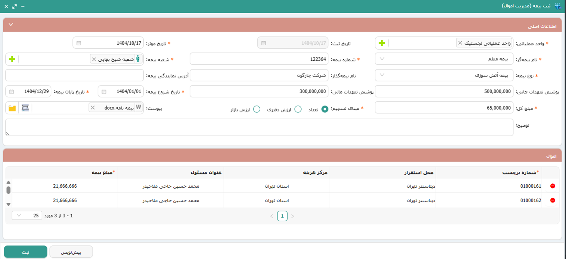 اطلاعات مرتبط با بیمه داراییها و گواهیهای مرتبط با آنها در سیستم ثبت و نگهداری میشود؛ از شماره بیمهنامه و شرکت بیمهگر تا تاریخ شروع و پایان اعتبار. این قابلیت به سازمان کمک میکند پوشش بیمهای داراییها را کنترل کرده، از انقضای بیمهها جلوگیری کند و ریسکهای مالی مرتبط با داراییها را کاهش دهد.