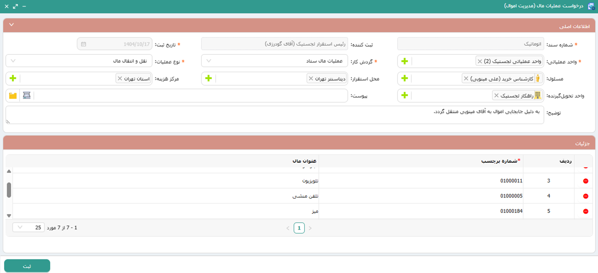 تمام عملیات اموال میتوانند از طریق ثبت درخواست و بر اساس روالهای تعریفشده سازمان انجام شوند. امکان تعریف چندمرحلهای تأیید متناسب با ساختار هر واحد سازمانی وجود دارد تا عملیاتها با دقت، امنیت و کنترل بیشتری اجرا شوند.