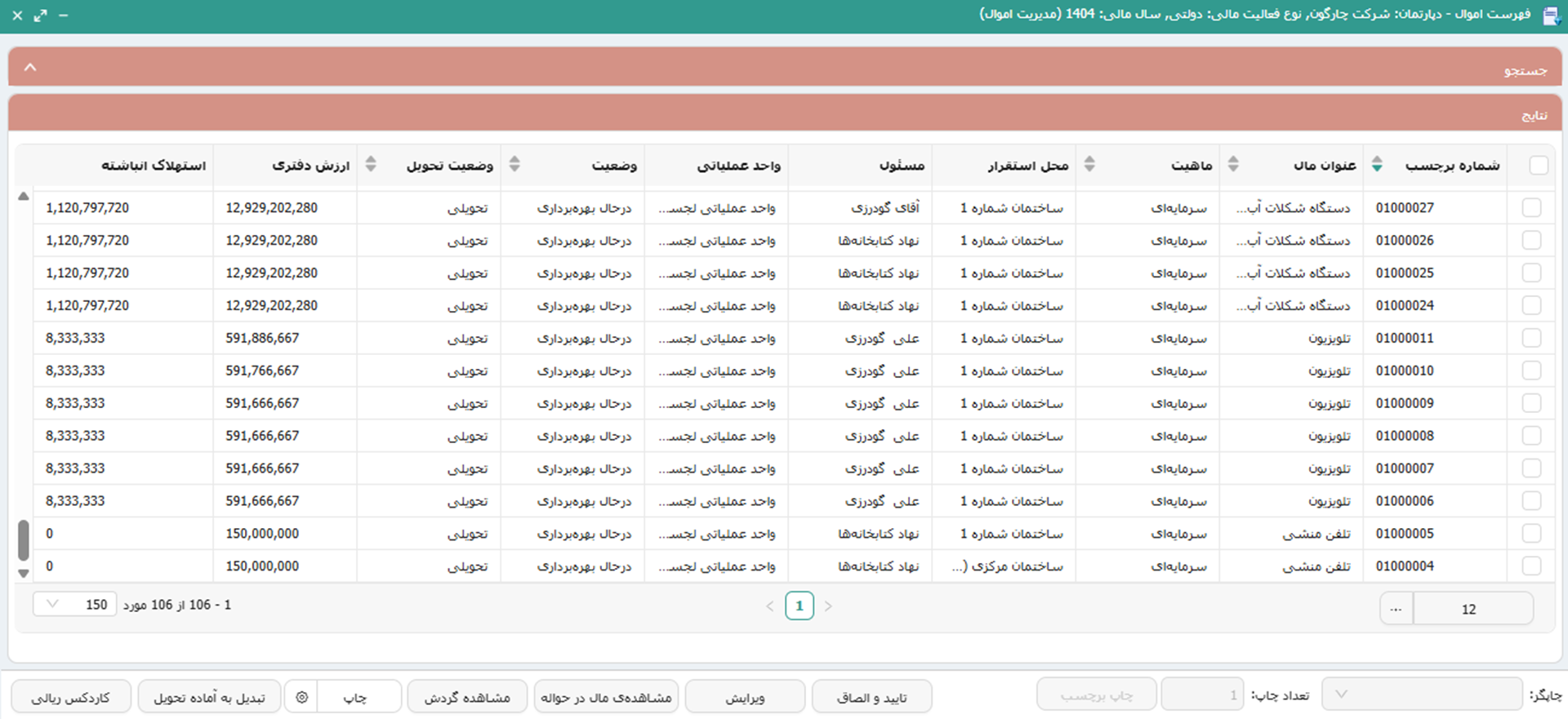 تمام مراحل از ثبت تا خروج دارایی شفاف و مستند ثبت میشود و امکان پیگیری هر رویداد در هر زمان فراهم است؛ این شفافیت، مغایرتها را کاهش میدهد.