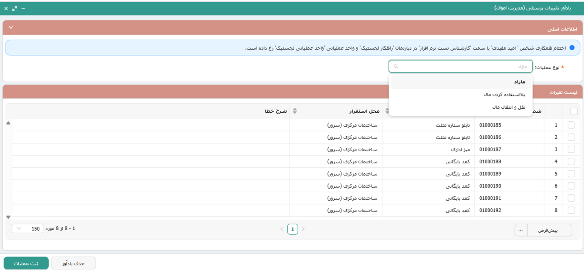 در مراحل پایان عمر دارایی نیز، عملیاتهایی مانند اسقاط، مازاد، بلااستفاده، فروش یا اهدا بهصورت دقیق ثبت میشوند. همچنین امکان واگذاری اموال به سازمانهای دیگر و دریافت اموال امانی از سایر سازمانها وجود دارد تا تغییرات مالکیت یا وضعیت استفاده داراییها بهطور کامل مستندسازی شود.